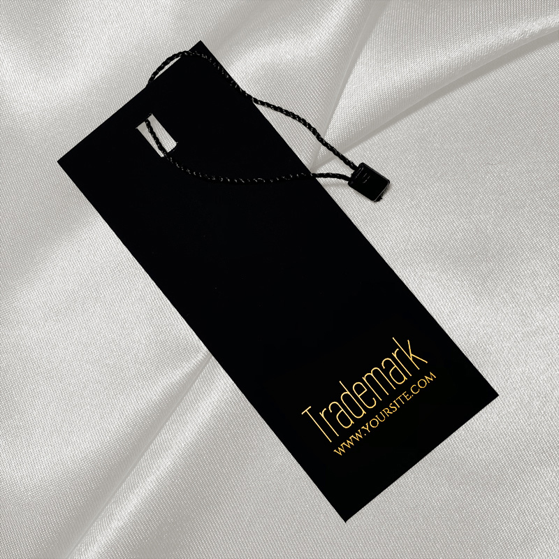 Kartónová etiketa na oblečenie vrátane tesnenia s polyesterovou šnúrkou na upevnenie model HT-M108, vyrobená z hrubého čierneho kartónu, personalizovaná zlatým textom alebo logom. Tento typ visačky je vyrobený z vysokokvalitných materiálov a využíva najmodernejšie technológie digitálnej tlače a povrchovej úpravy.