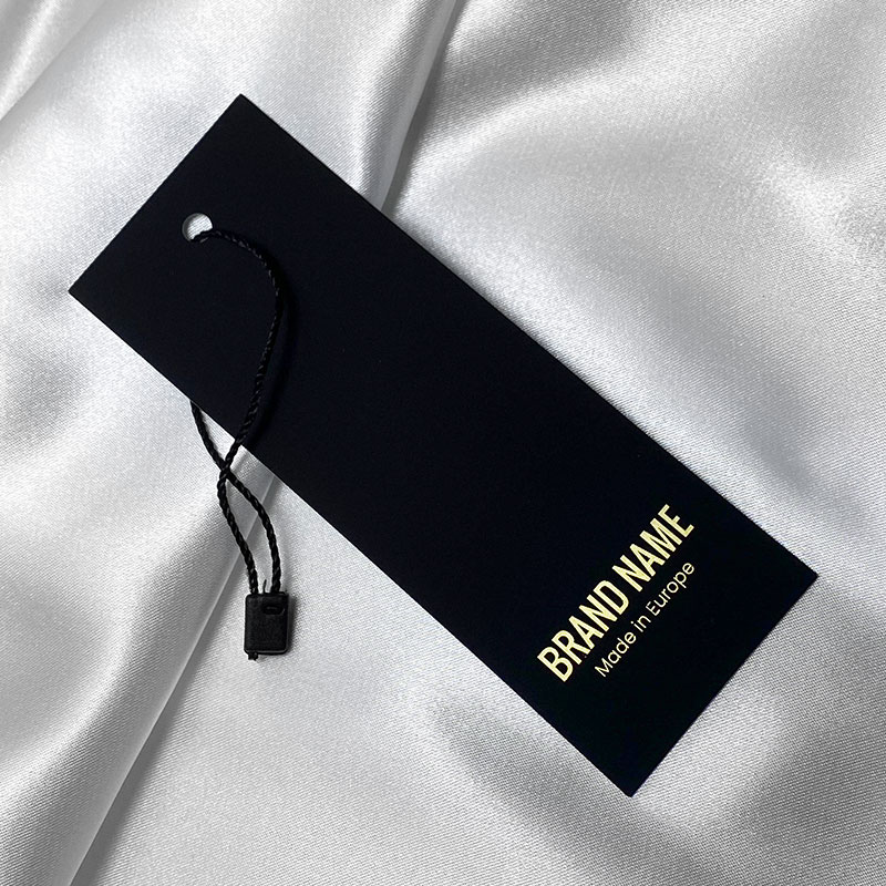 Štítok na oblečenie alebo odevné doplnky, vyrobený na zákazku z čierneho kartónu Soft Touch, upravený striebornou fóliou s názvom značky alebo logom. Tento typ visačky je vyrobený z vysokokvalitných materiálov a využíva najmodernejšie technológie digitálnej tlače a povrchovej úpravy.