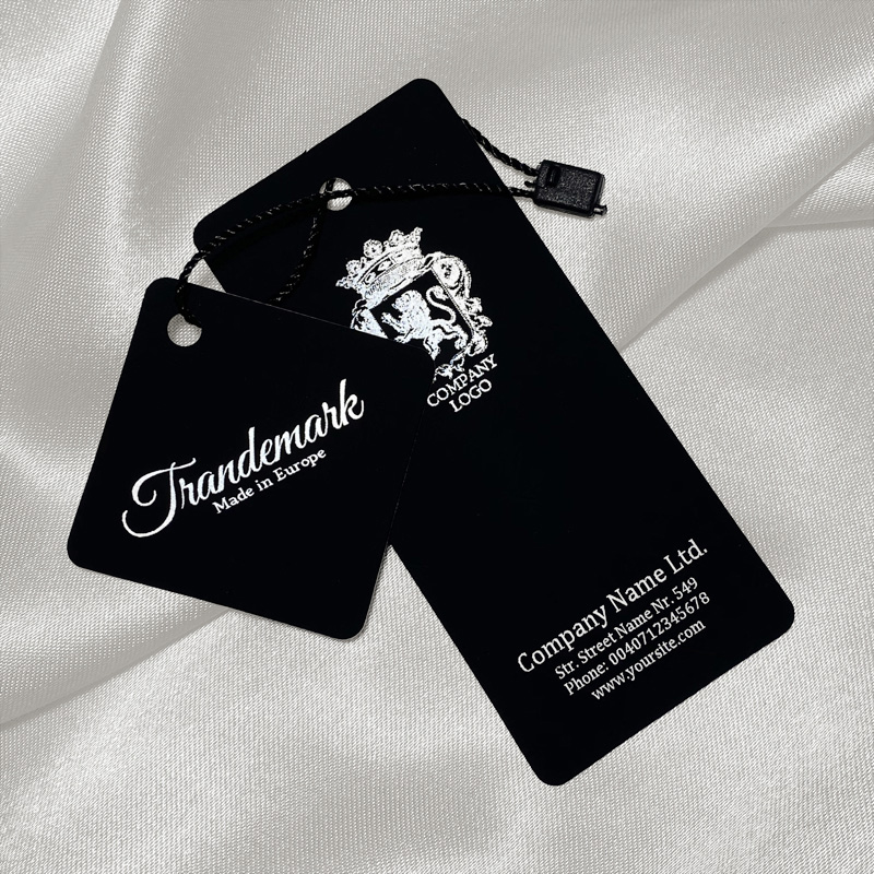 Sada pozostáva z 2 nádherných kartónových štítkov vrátane pečate so šnúrkou na oblečenie, ktoré sú vyrobené z čierneho laminovaného kartónu Soft Touch a personalizované striebornou fóliovou digitálnou pečiatkou typu Hot Stamp. Tento typ visačky je vyrobený z vysokokvalitných materiálov a využíva najmodernejšie technológie digitálnej tlače a povrchovej úpravy.