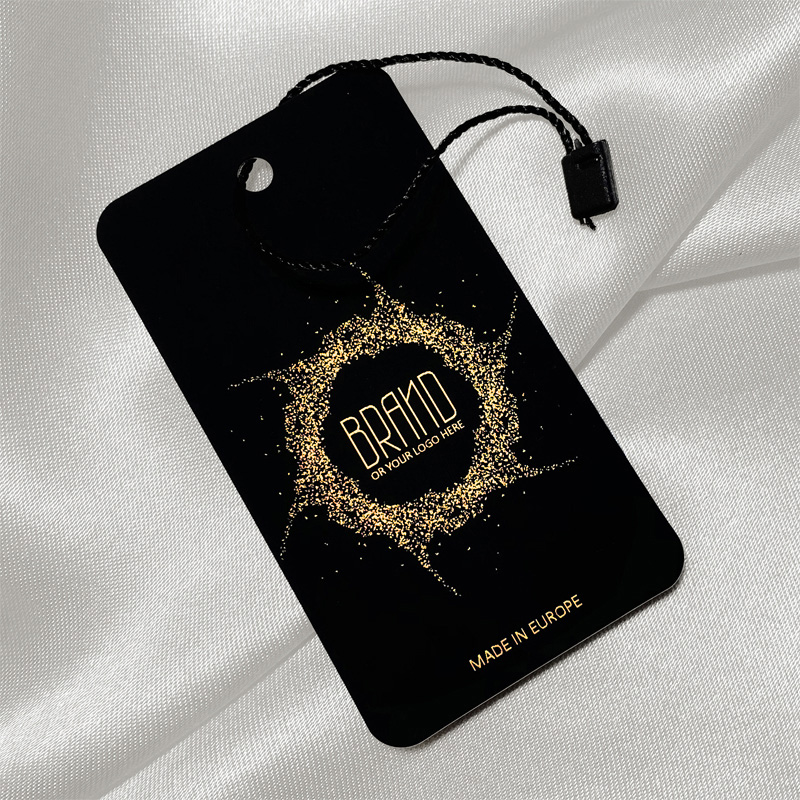 Visačka na oblečenie model HT-M95 s pečaťou a polyesterovou šnúrkou na zavesenie oblečenia, prispôsobená zlatým písmom na laminovanom kartóne s čiernou fóliou. Tento typ visačky je vyrobený z vysokokvalitných materiálov a využíva najmodernejšie technológie digitálnej tlače a povrchovej úpravy.