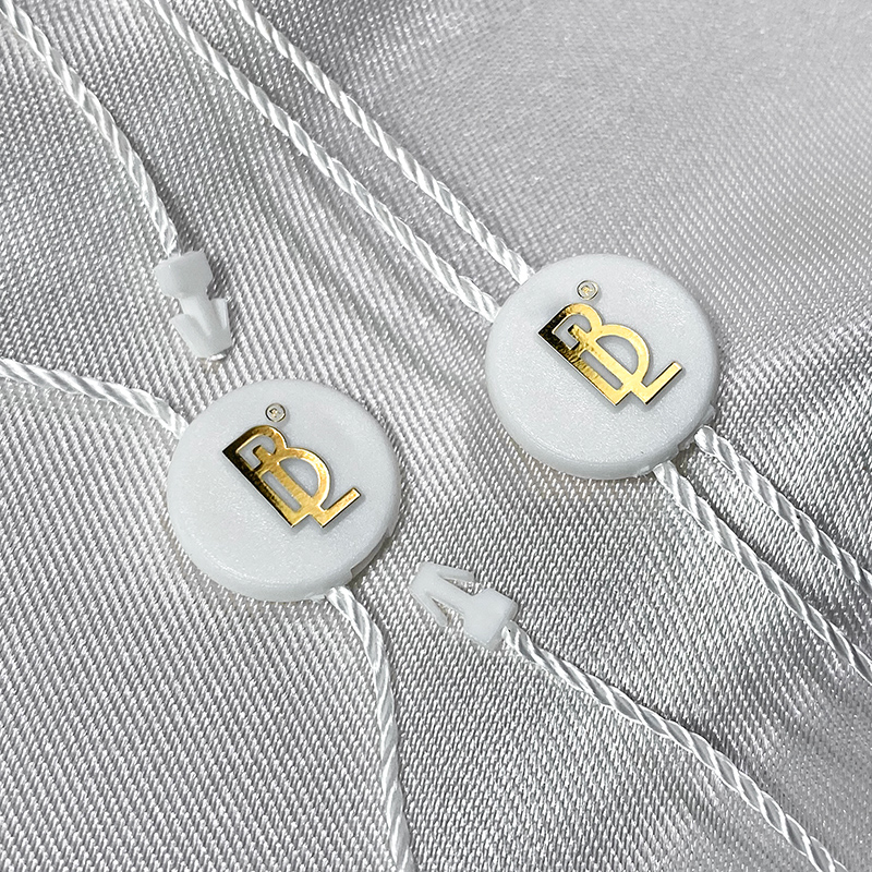 Plastové tesnenie ST-M34 s okrúhlym tvarom, veľmi elegantné a krásne prispôsobené na dvoch stranách s názvom značky alebo emblémom, vhodné na oblečenie, obuv, tašky atď. Tento typ plomby je vyrobený z vysokokvalitných materiálov s použitím najmodernejších technológií v tejto oblasti