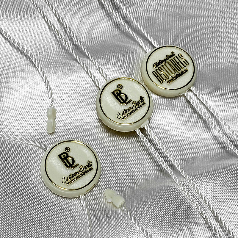 Plastové tesnenie ST-M92 s okrúhlym tvarom, veľmi elegantné a krásne prispôsobené na dvoch stranách s názvom značky alebo emblémom, vhodné na oblečenie, obuv, tašky atď. Tento typ plomby je vyrobený z vysokokvalitných materiálov s použitím najmodernejších technológií v tejto oblasti