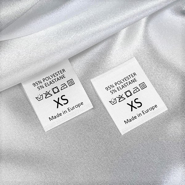 Štítok na starostlivosť o bielizeň vytlačený na bielom saténe so symbolmi prania, zložením materiálu a indikátorom veľkosti, s ultrazvukovo rezanými okrajmi. Tento typ textilnej etikety sa vyrába pomocou najmodernejších technológií v oblasti digitálnej tlače na textilný podklad. Etikety sa tlačia na špeciálny satén termotransferovou metódou, ktorá zabezpečuje pôsobivú kvalitu tlače a vysokú odolnosť voči praniu.
