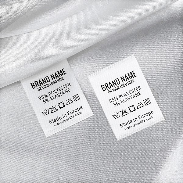 Štítok na starostlivosť o bielizeň prispôsobený názvu značky, zloženiu tkaniny, symbolom prania a starostlivosti, vytlačený na bielom saténe a na okrajoch ultrazvukovo rezaný. Tento typ textilnej etikety sa vyrába pomocou najmodernejších technológií v oblasti digitálnej tlače na textilný podklad. Etikety sa tlačia na špeciálny satén termotransferovou metódou, ktorá zabezpečuje pôsobivú kvalitu tlače a vysokú odolnosť voči praniu.