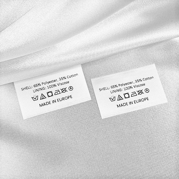 Textilná etiketa so symbolmi prania a starostlivosti a informáciami o zložení materiálu, upravená na jemný vysokokvalitný satén, strihaný ultrazvukom za tepla. Tento typ textilnej etikety sa vyrába pomocou najmodernejších technológií v oblasti digitálnej tlače na textilný podklad. Etikety sa tlačia na špeciálny satén termotransferovou metódou, ktorá zabezpečuje pôsobivú kvalitu tlače a vysokú odolnosť voči praniu.