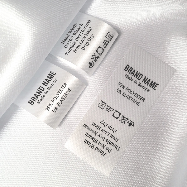 Štítok na starostlivosť o bielizeň na oblečenie, prispôsobený textom s digitálnou tlačou na bielom saténe, vhodný pre akýkoľvek odevný výrobok. Tento typ textilnej etikety sa vyrába pomocou najmodernejších technológií v oblasti digitálnej tlače na textilný podklad. Etikety sa tlačia na špeciálny satén termotransferovou metódou, ktorá zabezpečuje pôsobivú kvalitu tlače a vysokú odolnosť voči praniu.
