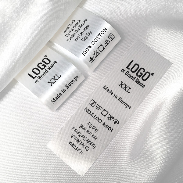 Textilná etiketa na odevy s potlačou na jemnom saténe s indikátorom veľkosti, symbolmi prania a pokynmi na pranie, vhodná na rôzne odevy a textilné výrobky. Tento typ textilnej etikety sa vyrába pomocou najmodernejších technológií v oblasti digitálnej tlače na textilný podklad. Etikety sa tlačia na špeciálny satén termotransferovou metódou, ktorá zabezpečuje pôsobivú kvalitu tlače a vysokú odolnosť voči praniu.