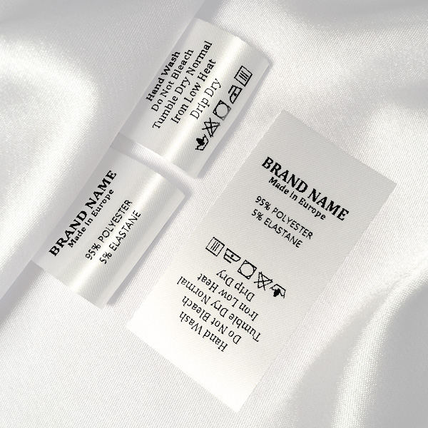 Štítok na starostlivosť o oblečenie, prispôsobený čiernym textom vytlačeným na bielom saténe s jemnou textúrou. Tento typ textilnej etikety sa vyrába pomocou najmodernejších technológií v oblasti digitálnej tlače na textilný podklad. Etikety sa tlačia na špeciálny satén termotransferovou metódou, ktorá zabezpečuje pôsobivú kvalitu tlače a vysokú odolnosť voči praniu.