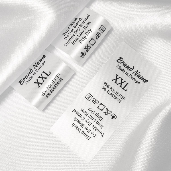 Štítok na starostlivosť o bielizeň prispôsobený veľkosti na jemnom bielom saténe, vhodný na oblečenie, rôzne odevy a textilné výrobky. Tento typ textilnej etikety sa vyrába pomocou najmodernejších technológií v oblasti digitálnej tlače na textilný podklad. Etikety sa tlačia na špeciálny satén termotransferovou metódou, ktorá zabezpečuje pôsobivú kvalitu tlače a vysokú odolnosť voči praniu.