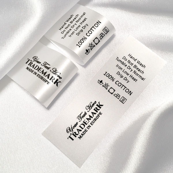 Štítok na starostlivosť o bielizeň vhodný na oblečenie a rôzne textilné výrobky, najmä odevy, prispôsobený na jemný biely satén. Tento typ textilnej etikety sa vyrába pomocou najmodernejších technológií v oblasti digitálnej tlače na textilný podklad. Etikety sa tlačia na špeciálny satén termotransferovou metódou, ktorá zabezpečuje pôsobivú kvalitu tlače a vysokú odolnosť voči praniu.