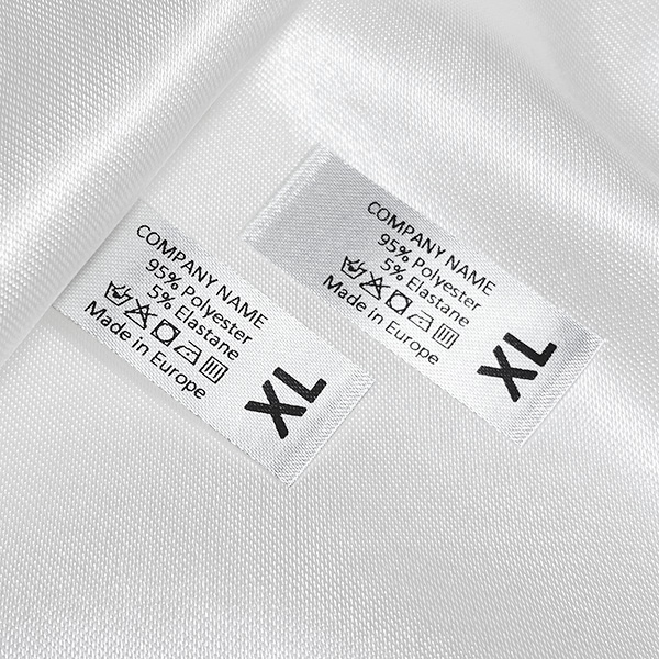 Štítok na starostlivosť o bielizeň a zloženie s veľkosťami a pracími symbolmi z kvalitného saténu na našitie na oblečenie. Tento typ textilnej etikety sa vyrába pomocou najmodernejších technológií v oblasti digitálnej tlače na textilný podklad. Etikety sa tlačia na špeciálny satén termotransferovou metódou, ktorá zabezpečuje pôsobivú kvalitu tlače a vysokú odolnosť voči praniu.