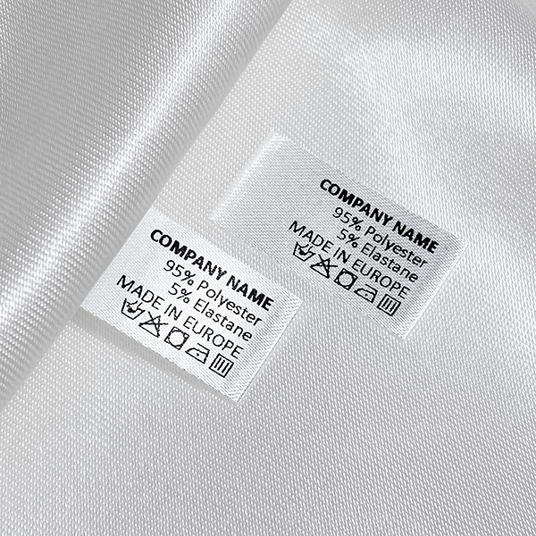 Vlastný štítok na starostlivosť o bielizeň s malými rozmermi na našitie na rôzne kusy oblečenia, vyrobený na zákazku zo saténu. Tento typ textilnej etikety sa vyrába pomocou najmodernejších technológií v oblasti digitálnej tlače na textilný podklad. Etikety sa tlačia na špeciálny satén termotransferovou metódou, ktorá zabezpečuje pôsobivú kvalitu tlače a vysokú odolnosť voči praniu.