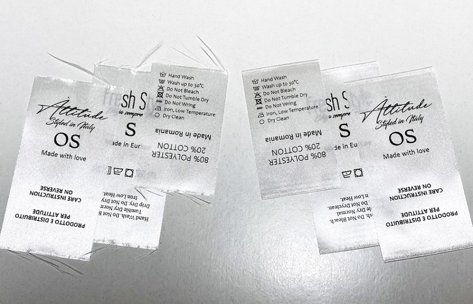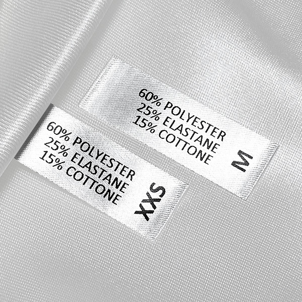 Štítok na starostlivosť o bielizeň na objednávku s veľkosťami, vyrobený zo saténu prvotriednej kvality, s údajmi o zložení materiálu, na našitie na oblečenie. Tento typ textilnej etikety sa vyrába pomocou najmodernejších technológií v oblasti digitálnej tlače na textilný podklad. Etikety sa tlačia na špeciálny satén termotransferovou metódou, ktorá zabezpečuje pôsobivú kvalitu tlače a vysokú odolnosť voči praniu.