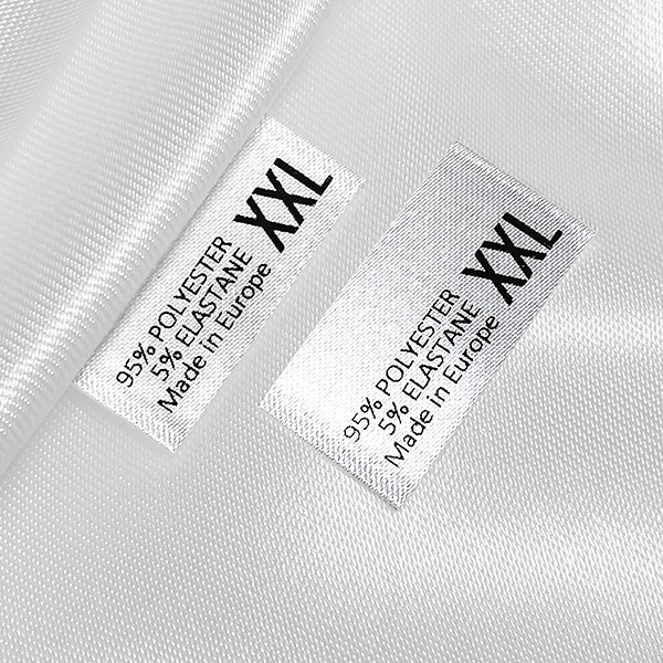 Štítok na starostlivosť o bielizeň so zložením materiálu a s veľkosťami, prispôsobený na objednávku s údajmi výrobcu a typom materiálu, na našitie na odevy alebo rôzne časti oblečenia. Tento typ textilnej etikety sa vyrába pomocou najmodernejších technológií v oblasti digitálnej tlače na textilný podklad. Etikety sa tlačia na špeciálny satén termotransferovou metódou, ktorá zabezpečuje pôsobivú kvalitu tlače a vysokú odolnosť voči praniu.
