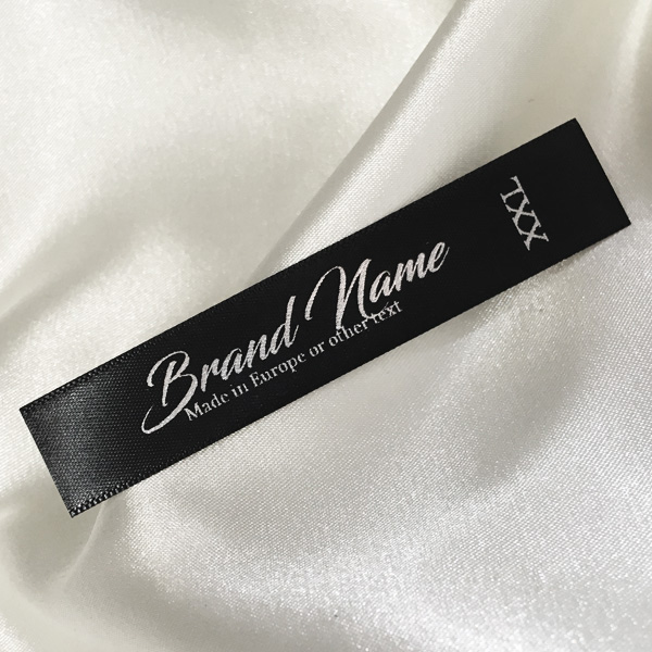 Značková etiketa Frabric s indikátorom veľkosti, prispôsobená textom vytlačeným na saténe rôznych farieb, vhodná na oblečenie, odevné doplnky a rôzne textilné výrobky. Tento typ textilnej etikety sa vyrába pomocou najmodernejších technológií v oblasti digitálnej tlače na textilný podklad. Etikety sa tlačia na špeciálny satén termotransferovou metódou, ktorá zabezpečuje pôsobivú kvalitu tlače a vysokú odolnosť voči praniu.