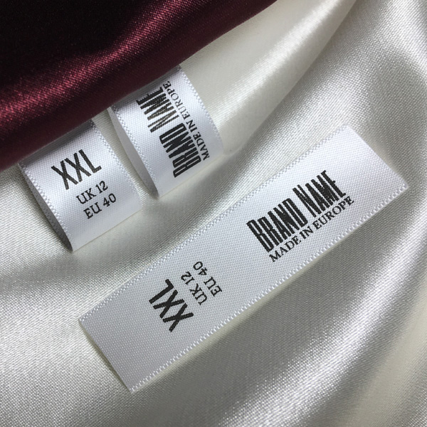 Štítok s veľkosťou oblečenia vytlačený na saténe, prispôsobený s názvom značky alebo logom na zadnej strane, vhodný pre oblečenie. Tento typ textilnej etikety sa vyrába pomocou najmodernejších technológií v oblasti digitálnej tlače na textilný podklad. Etikety sa tlačia na špeciálny satén termotransferovou metódou, ktorá zabezpečuje pôsobivú kvalitu tlače a vysokú odolnosť voči praniu.