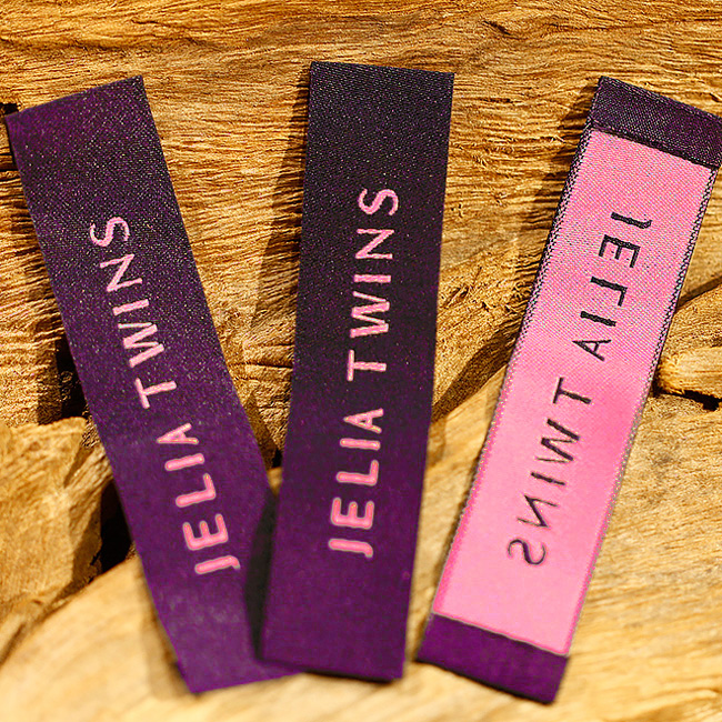 Textilná etiketa pre model oblečenia Fashion Style s názvom značky v niekoľkých farbách na textilnom materiáli, ako je satén, taft alebo damašek. Tento typ tkaného štítku je vyrobený z vysokokvalitných materiálov za použitia najmodernejších technológií digitálnej výšivky na priemyselnej úrovni.