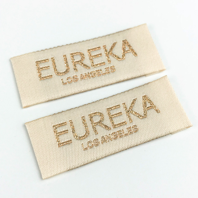 Štítok na oblečenie z damašku, tkaný vyšívacou niťou alebo lurexovou niťou model WL-M10, personalizovaný s názvom značky alebo logom. Tento typ tkaného štítku je vyrobený z vysokokvalitných materiálov za použitia najmodernejších technológií digitálnej výšivky na priemyselnej úrovni.